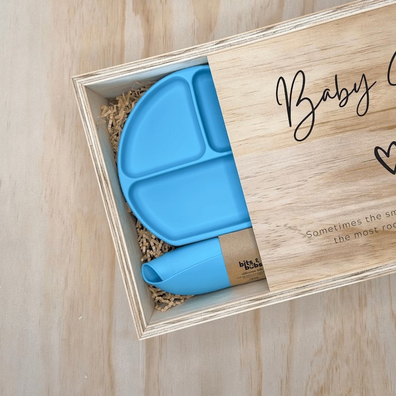 Our Silicone feeding set with Keepsake bundle perfect baby or toddler gift that keeps on giving! Create less mess during feeding times, more special memories as you introduce baby to solids then store those special memories safely in a Personalised Keepsake Box!